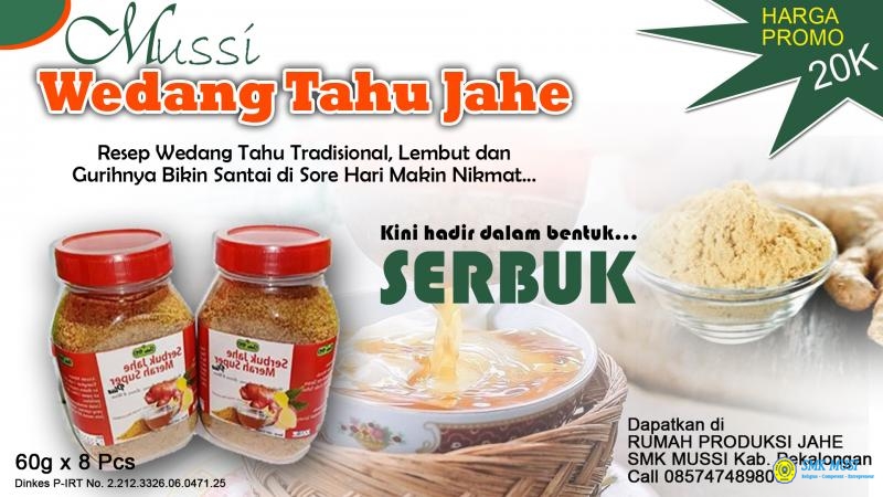 SMK Muhammadiyah Kesesi terus menjalankan program pembelajaran kewirausahaan, diantara yang masih terus dikembangkan adalah Mussi Jahe Merah (MJM) yang pada kesempatan kali ini akan memproduksi varian baru yaitu Mussi Wedang Tahu Jahe. produk ini adalah kolaborasi kembang tahu dengan serbuk jahe merah ditambah dengan manis gula aren. Semoga varian baru ini akan segera mendongkrak pasar jahe.